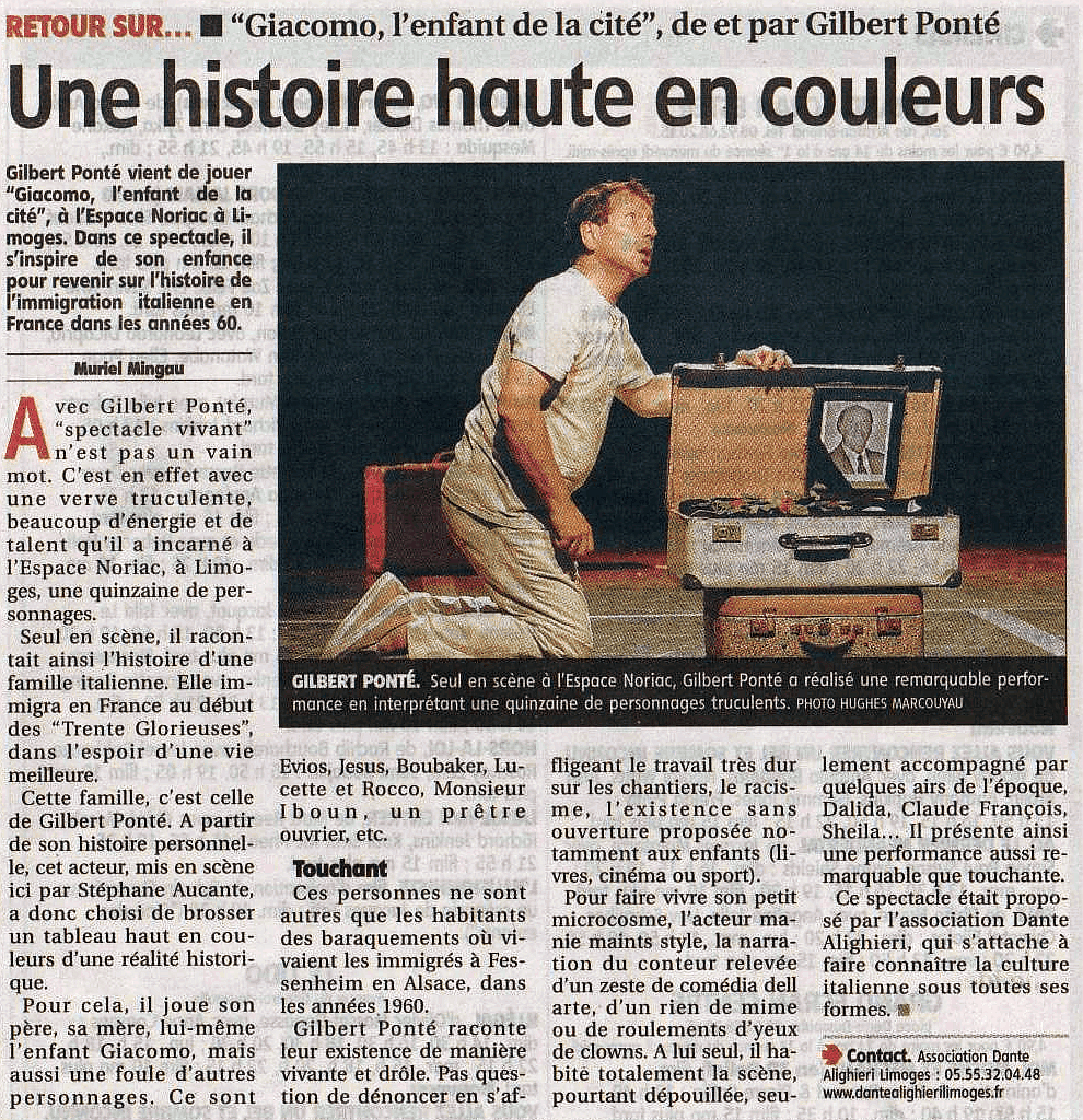 En solo sur scène il nous a déjà enchantés avec les personnages de son enfance (voir les commentaires des spectateurs sur Giacomo, l'enfant de la cité donné en octobre dernier). Cette seconde partie voit grandir Giacomo, s'enrichir son expérience du monde et aussi s'approfondir le jeu de Gilbert Ponté. L'auteur, l'acteur et le personnage de Giacomo ne font qu'un, conférant à ce triptyque (la troisième partie Le monde est grand, Giacomo sera programmée cet automne) l'authenticité qui emporte notre émotion.